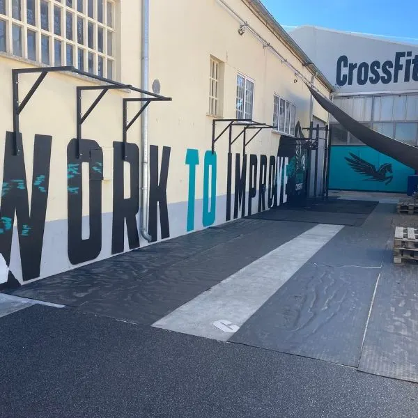 Este mural diseñado para la zona exterior de un box de CrossFit transmite energía, constancia y superación. Con un mensaje claro —“WORK TO IMPROVE”— pintado a gran escala, se convierte en un poderoso recordatorio para todos los atletas que entrenan en el espacio.