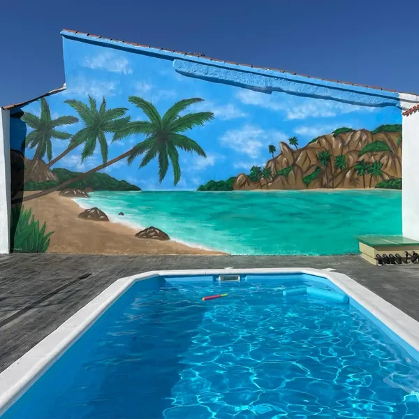 Este mural transforma el espacio de la piscina en un auténtico rincón paradisíaco. Con palmeras, arena blanca, aguas turquesas y un cielo despejado, la pared se convierte en una ventana abierta al Caribe.
